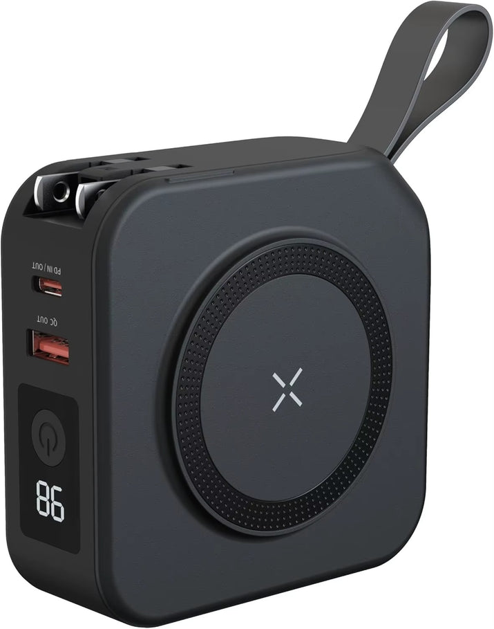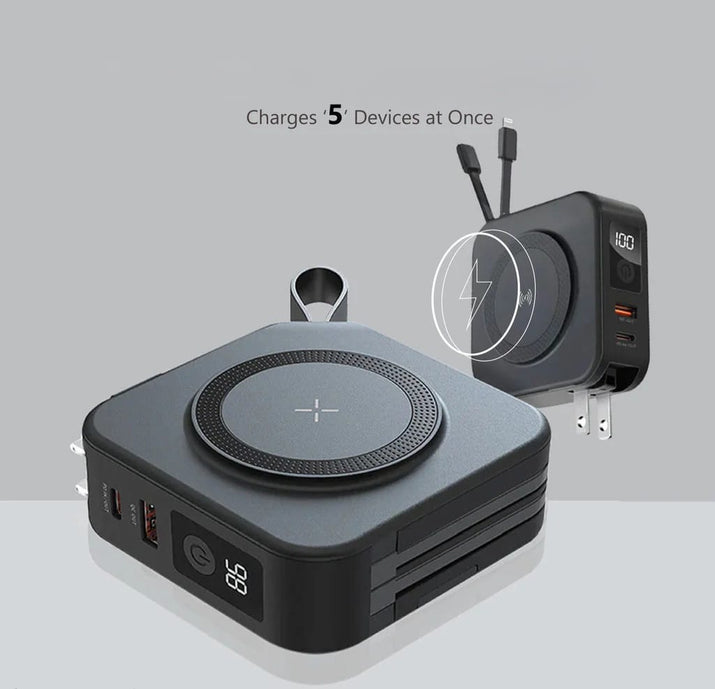 Die Benutzerfreundlichkeit ist ein zentrales Merkmal. Mit integrierten Kabeln und der magnetischen drahtlosen Ladefunktion können Sie Ihr Gerät bequem mit einer Hand aufladen, ideal für unterwegs, ohne sich um Kabelwirrwarr kümmern zu müssen.